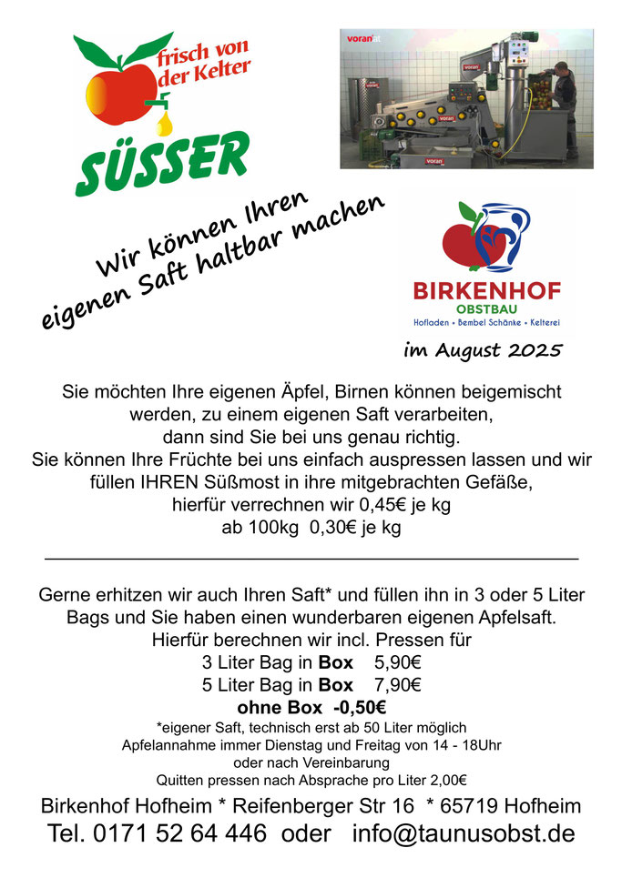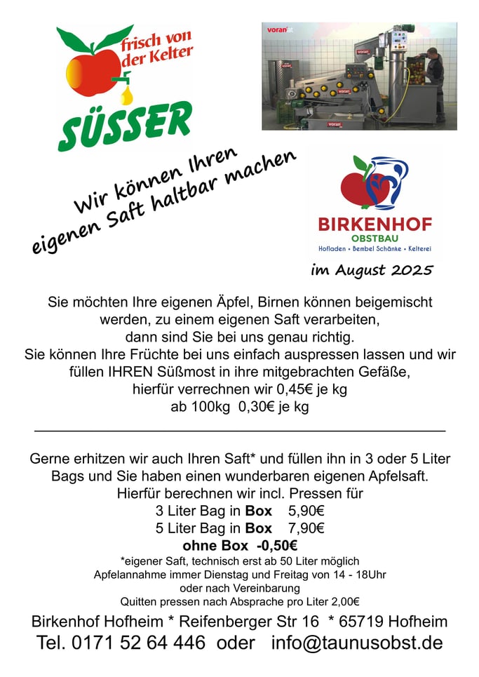 Ende August bis zum Abverkauf des letzten Apfels im Frühjahr des Folgejahres unser Kelterobst zu unserem Verkaufsschlager "frischer Süßer."